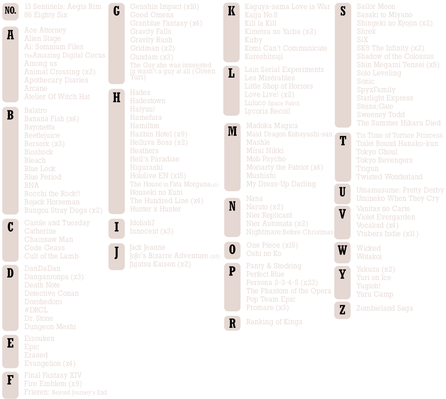 This catalogue is on alphanumeric order by the name of the series/videogame/anime.