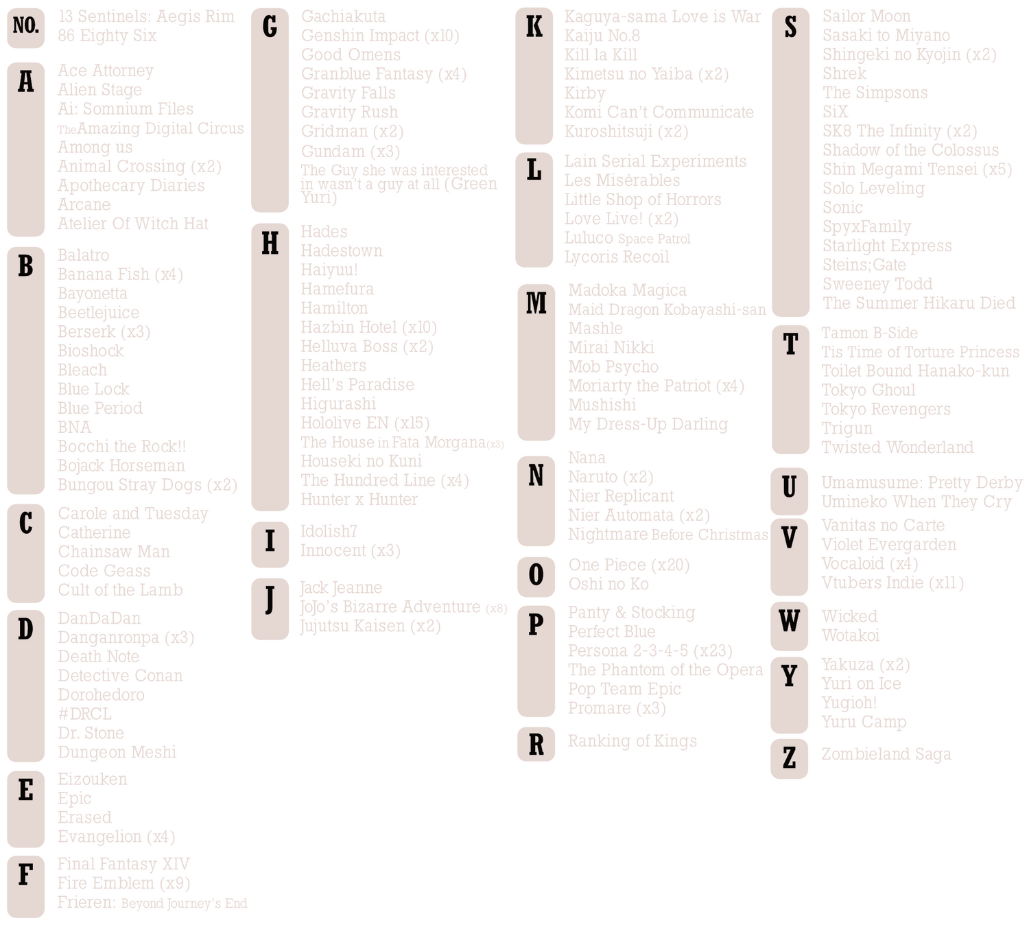 This catalogue is on alphanumeric order by the name of the series/videogame/anime.